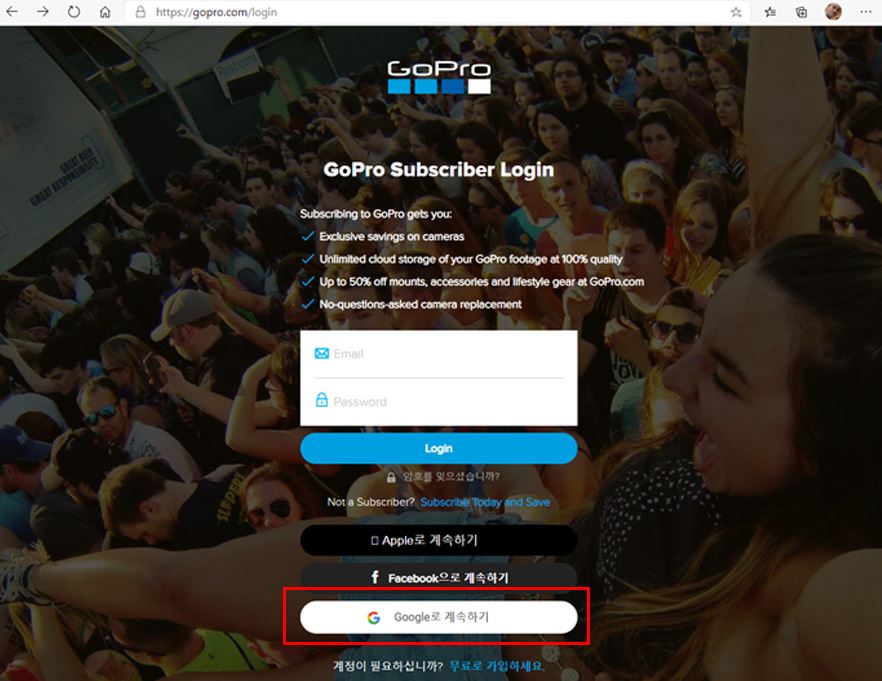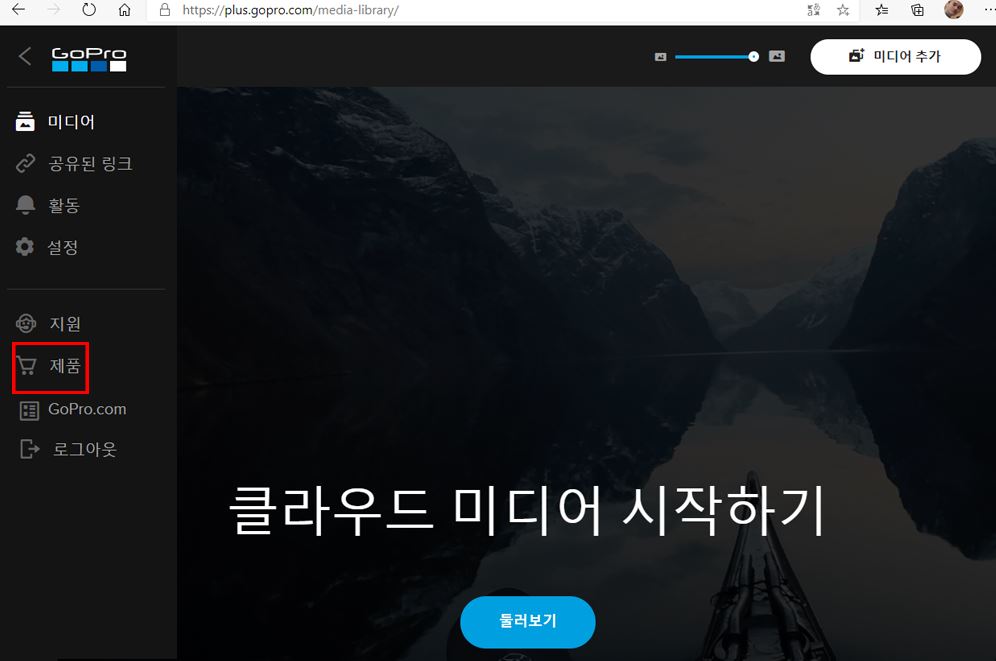 1. 먼저 고프로 공식홈페이지에 들어가서 우상단 사람모양을 클릭하고 로그인을 합니다.