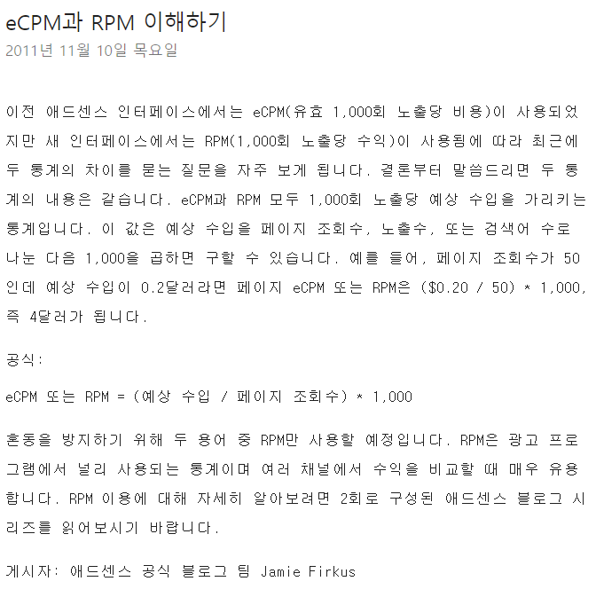 블로그에 광고를 넣어놨는데 eCPM이 높다는 것은, 똑같이 1000회 노출되었을 때, 가져가는 '수익'이 더 높다는 것이니까요. 이 경우, 퍼블리셔입장에서는 더 eCPM이 높은 광고의 위치, 종류 등의 분석을 하여 전략적인 광고배치 등을 꾀할 수 있을 것입니다.
