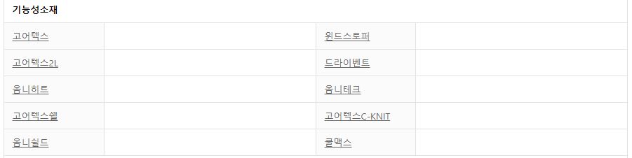 기능성 소재에 대해 이야기해보면.. 보통 아웃도어 제품들 중에 기본적인 브랜드 값이 그리 높지 않은 제품들을 보면, 출시가가 50만원선 이상부터 기능성 소재를 사용하고 있는것 같았어요. 가장 대표적인 기능성 소재는 '고어텍스'죠. 그 밖에도 아래와 같이 다양한 기능성 소재가 있는데요. 이렇게 기능성소재를 사용하고 있다면 더 고가라고 볼 수 있습니다. 또한 이러한 겉감 소재에 따라 무게도 달라져요. 보통 겉감으로 면소재가 많이 혼방될수록 무게가 무거웠던것 같고 기능성소재나 나일론의 경우에는 가벼웠던것 같아요.