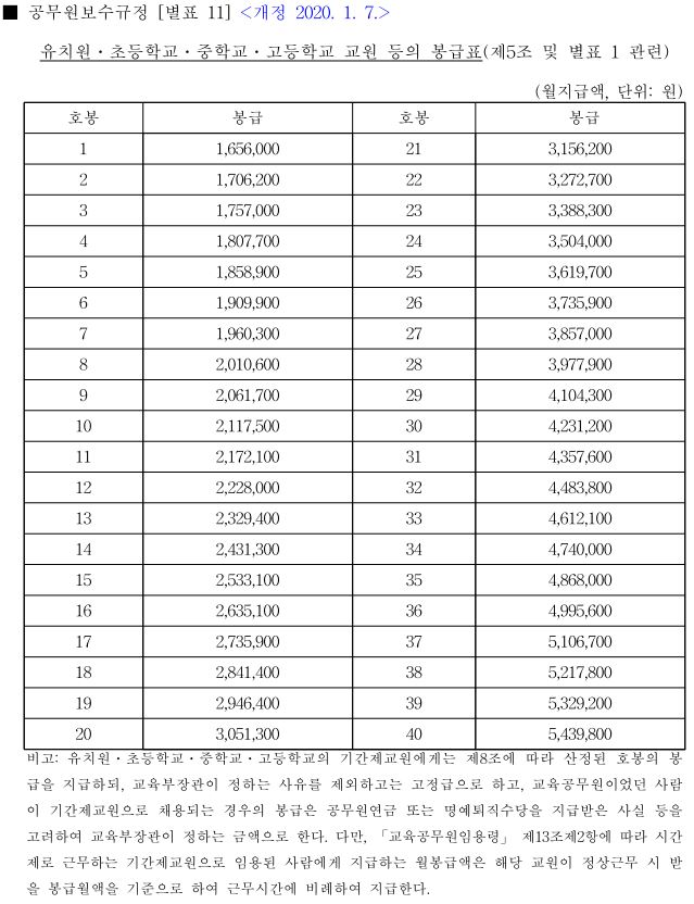 매 해 이러한 봉급인상율이 반영된 공무원 봉급표는 '법령 - 공무원보수규정 - 별표3에서 확인하실 수 있는데요. 2020년 봉급표는 올해 1월7일에 개정되었으니, 2021년 최종 봉급표도 역시 내년 1월7일경에 개정되어 확인하실 수 있을 것으로 사료됩니다. 따라서 일단 2020년도 공무원봉급표는 아래와 같으니, 0.9% 올해 봉급인상율을 반영하여 자체적으로 가늠해보시길 바랍니다.