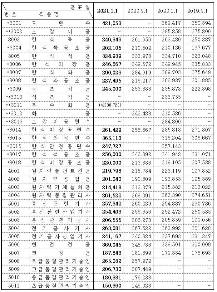 ** 표시 직종은 조사되지 않은 직종이므로 그 적용은 글 맨 마지막에 첨부한 원안 내 '이용상의 주의사항을 참고'하시길 바랍니다.