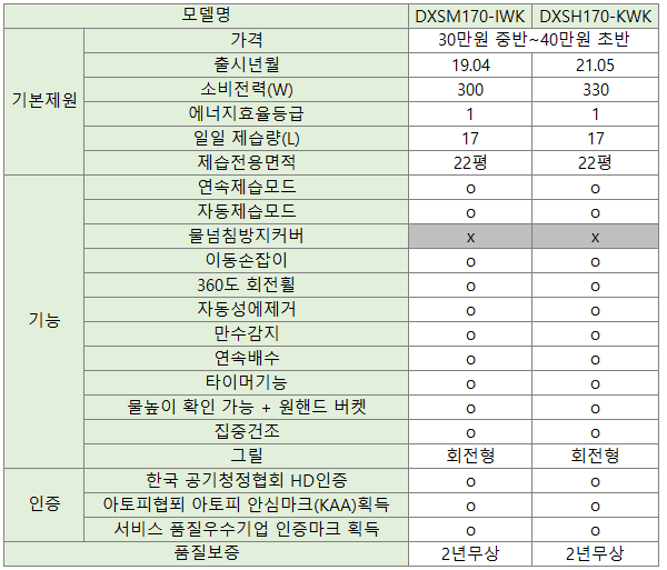 4. 위닉스 제습기 17리터 모델별 스펙