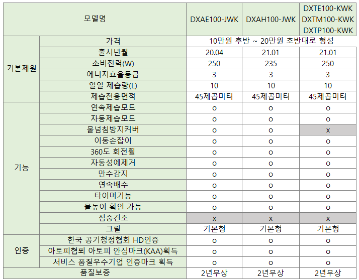 1. 위닉스 제습기 10리터 모델별 스펙